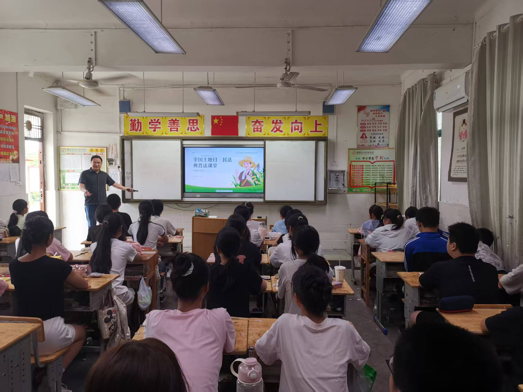 在“全国土地日进课堂”环节,来自湖北天泓律师事务所的资深律师冯木走进七(一)班,他以土地法律法规和民法典为立意,通过课件形式为学生们讲解全国土地日的由来、我国土地利用现状、政策法规体系、民法典运用、青少年导引等方面的知识,讲课图文并茂、深入浅出、简洁易懂,为学生们娓娓道来一堂生动的土地法制宣传课,迎来了大家阵阵掌声。