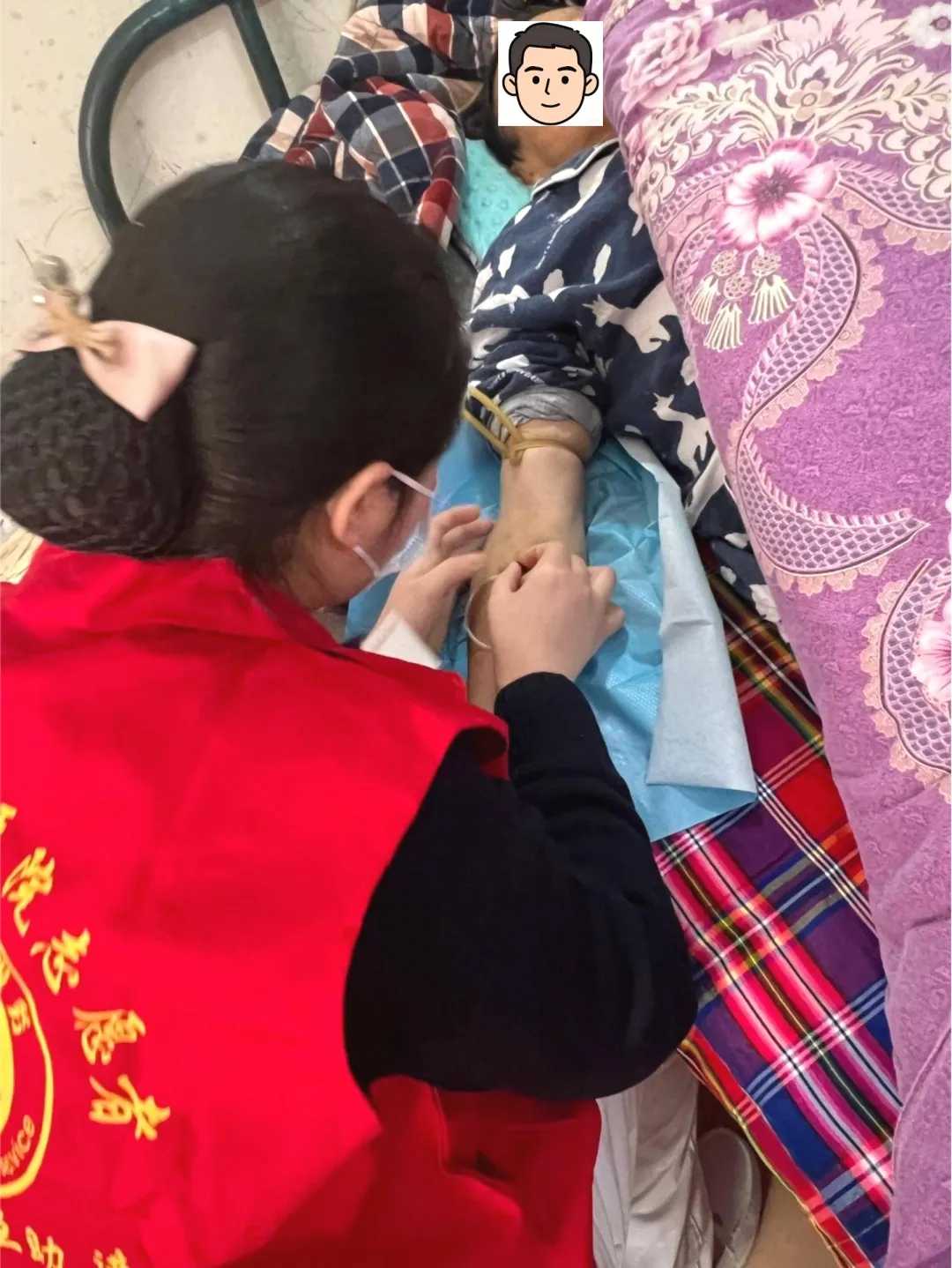近日,盘龙院区内科收到一位患者家属吕先生的求助,他的父亲吕大爷在外院行心脏搭桥及瓣膜置换术后卧床在家,因初期服用法华林需要每周检测凝血功能,吕大爷病情重且复杂,行动不便,住的是楼梯房,没有电梯。而自己靠打工维持整个家庭开销,打工收入微薄,家庭经济困难,因此每周的抽血复查成了吕先生全家最发愁的事。接到求助后,我们决定,派出科室“最强阵容”——不仅有经验丰富的护士团队,更有科室主任亲自带队,将温暖与关怀,直接送达患者的床前。