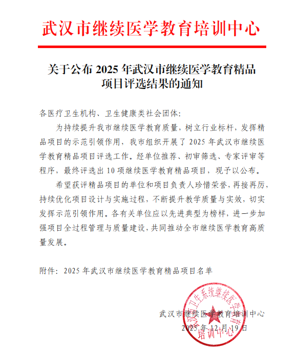 近日,武汉市黄陂区人民医院心血管内科主办的“武汉北部地区基层心血管急救能力提升班”凭借突出的教学质量与社会成效,成功获评2025年武汉市继续医学教育精品项目,成为区域基层医疗能力建设的标杆案例。