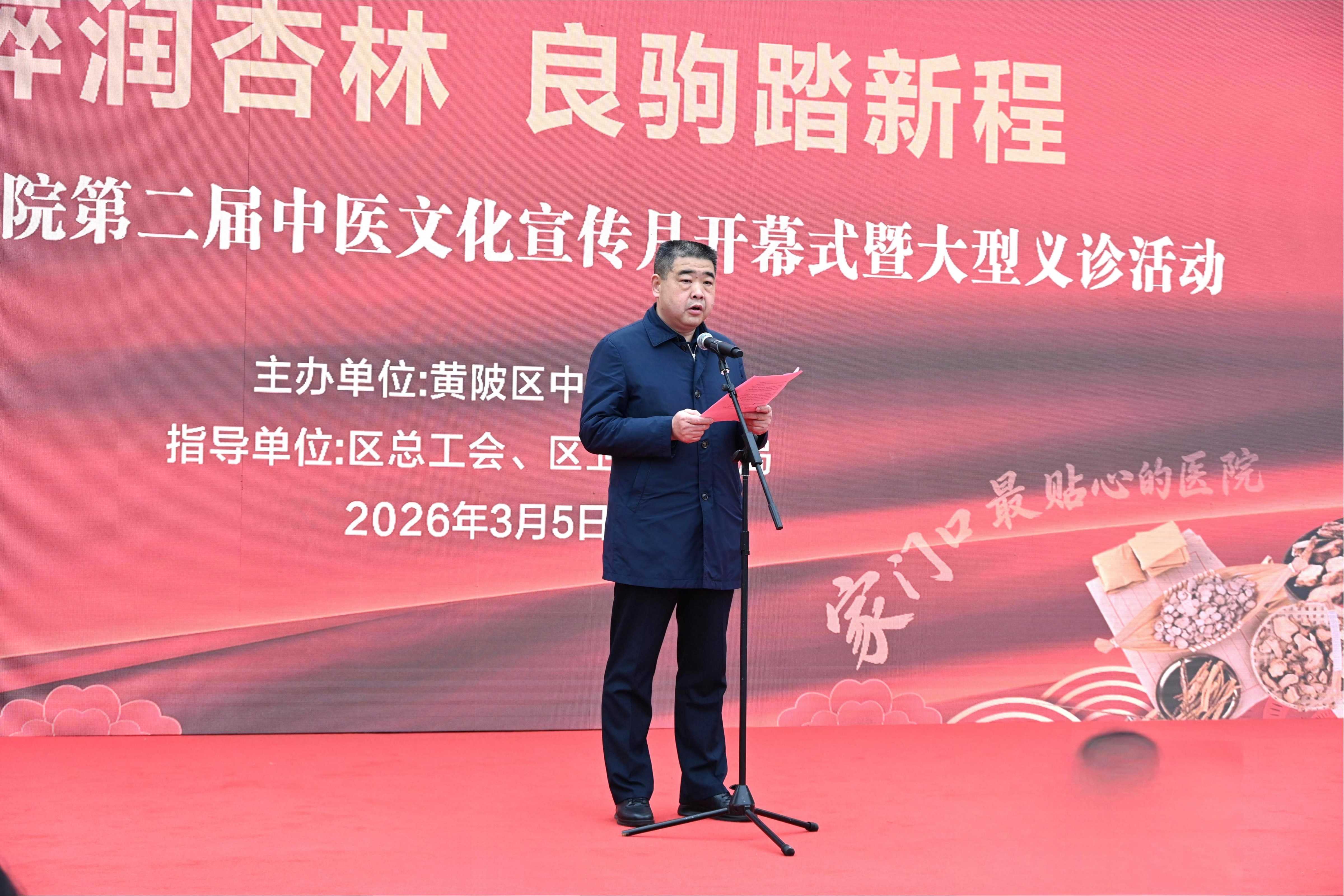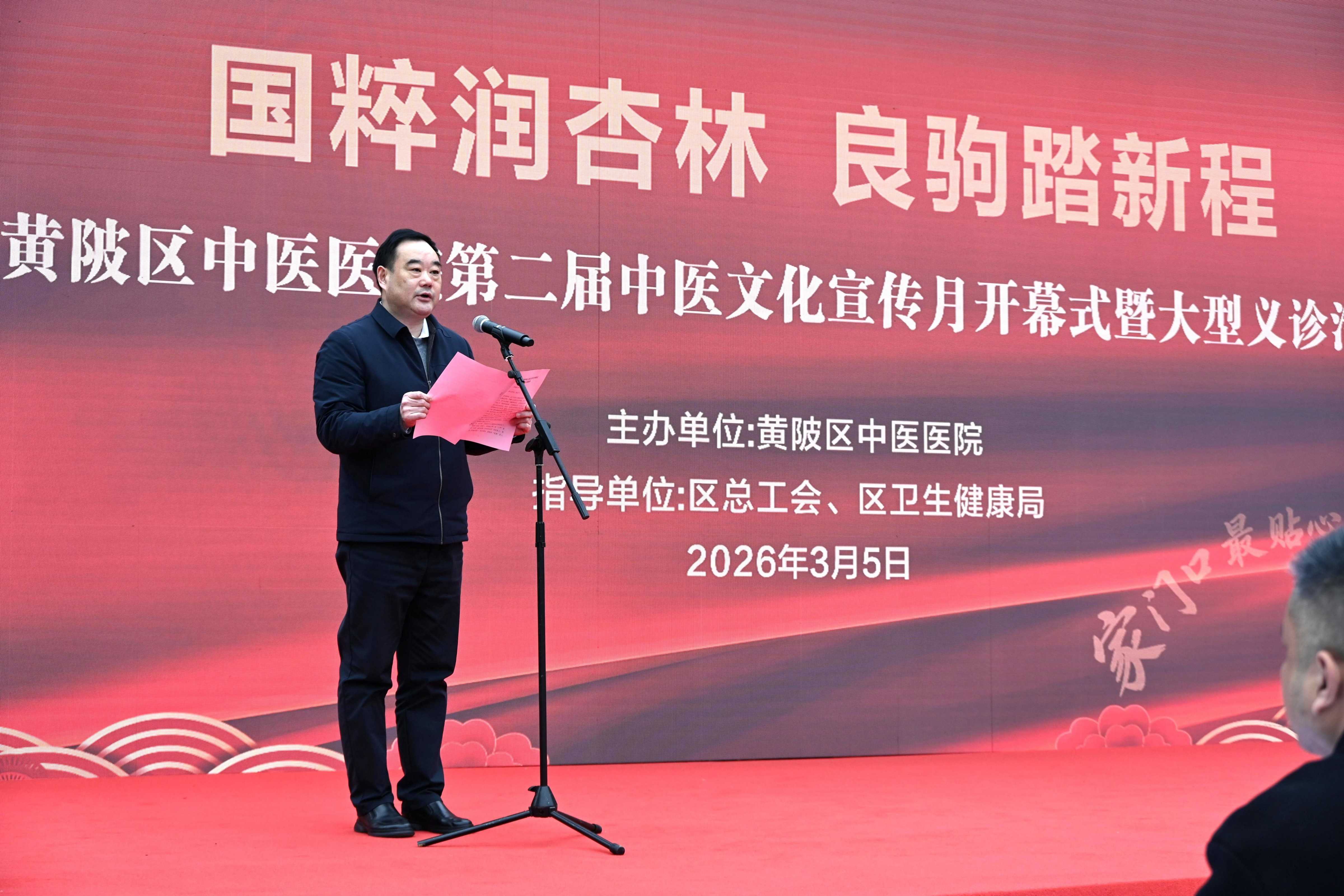 晨光熹微,黄陂广场人头攒动,暖意融融。上午 8:30,黄陂区中医医院 2026 年中医文化宣传月开幕式暨大型义诊活动正式拉开帷幕,区人大常委会副主任汪丽珍、政协副主席王四清及区委宣传部、区民政局、区医保局、区总工会、区妇联、区残联、区卫健局等相关单位领导出席活动,与市民朋友们共赴这场中医健康之约。开幕式由医院党委书记任正勇主持,欢快的开场舞《张灯结彩》点燃现场氛围,医护代表庄严宣誓,彰显医者仁心的使命与担当。