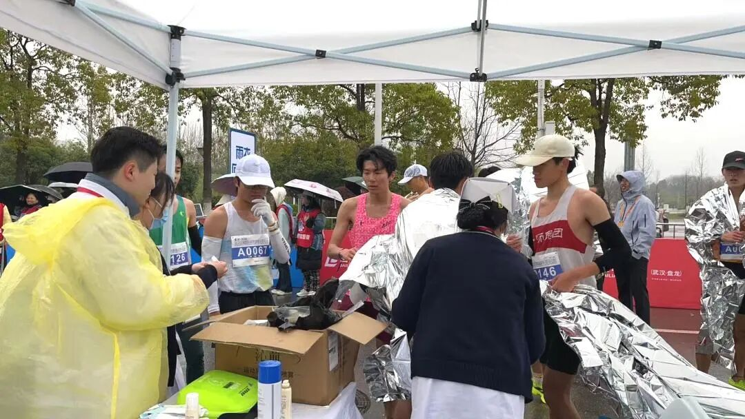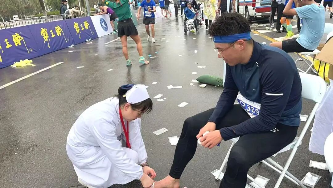 团队医疗力量精准覆盖赛道各关键节点,分别驻守2.5km、5km、20km等核心医疗站点,同时承担起终点医疗值守工作,与救护车组形成高效联动的急救保障网络。医护人员严格落实岗位责任制,全程保持待命状态,细致为参赛跑者提供血压监测、肌肉放松、伤口处理等健康专业服务,耐心解答跑者的健康咨询,全力保障每一位跑者的赛事体验与健康安全。