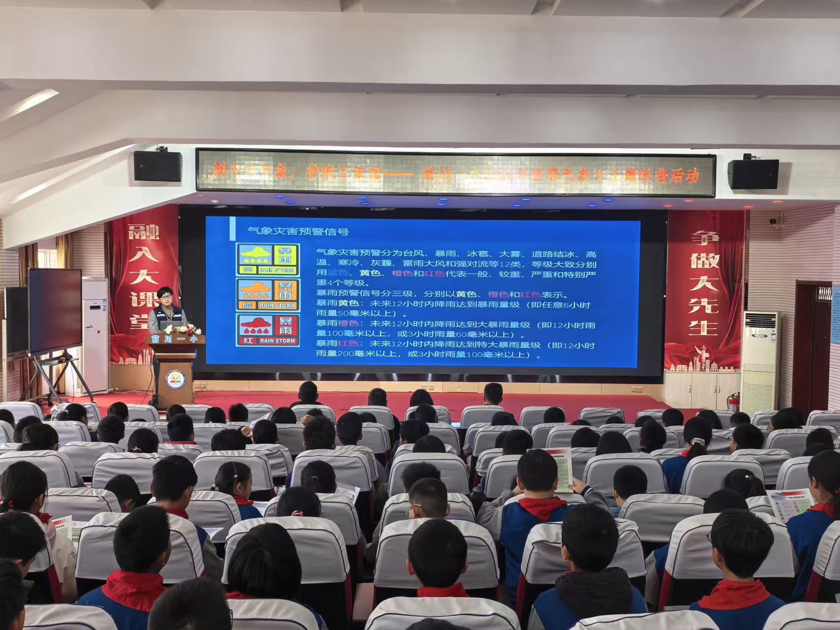 活动还特别设置了气象科普讲座环节,在报告厅内,工作人员向学生发放气象科普手册等资料,深入浅出地讲解了天气预报的制作过程、气象灾害的形成原因及防范措施,并通过现场提问互动,充分调动孩子们的学习热情,进一步提升了全校师生的防灾避险意识。