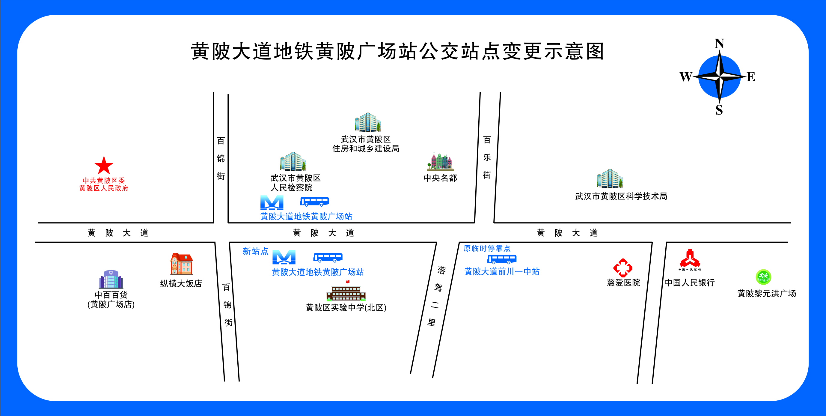 2、新公交站候车亭在黄陂大道地铁口近处南北双向设立,与临时停靠点间距约100米,方便接驳轨道交通。