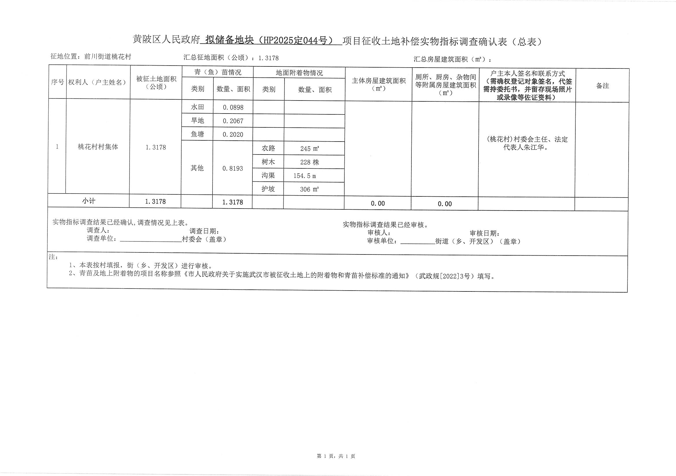 因实施黄陂区人民政府拟储备地块(HP2025定044号)项目建设等公共利益需要,黄陂区人民政府拟征收前川街桃花村共计1.3178公顷,用地范围图详见附件1。土地用途为城镇村道路用地。