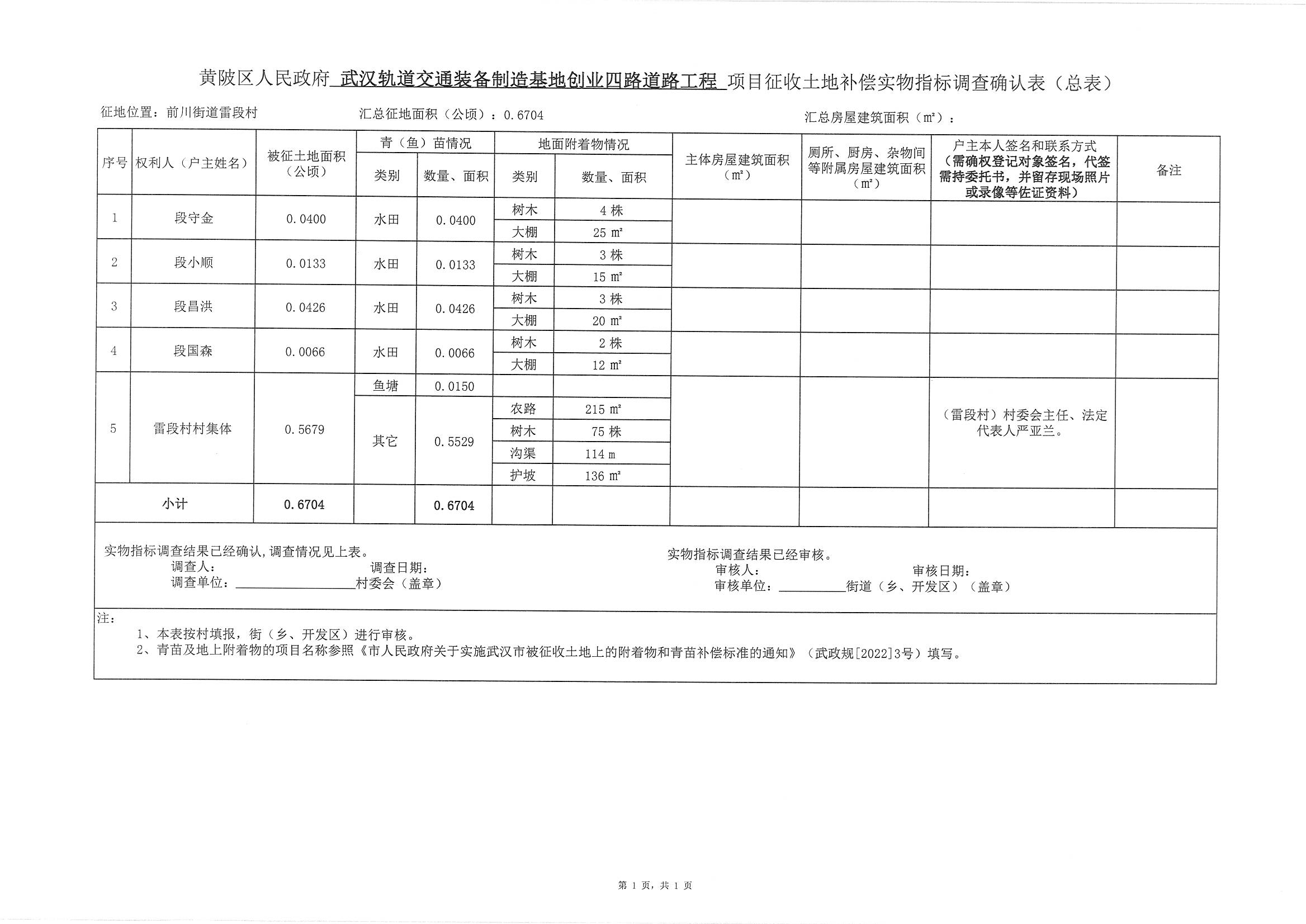 因实施武汉轨道交通装备制造基地创业四路道路工程建设等公共利益需要,黄陂区人民政府拟征收前川街雷段村共计0.6704公顷,用地范围图详见附件1。土地用途为城镇村道路用地。