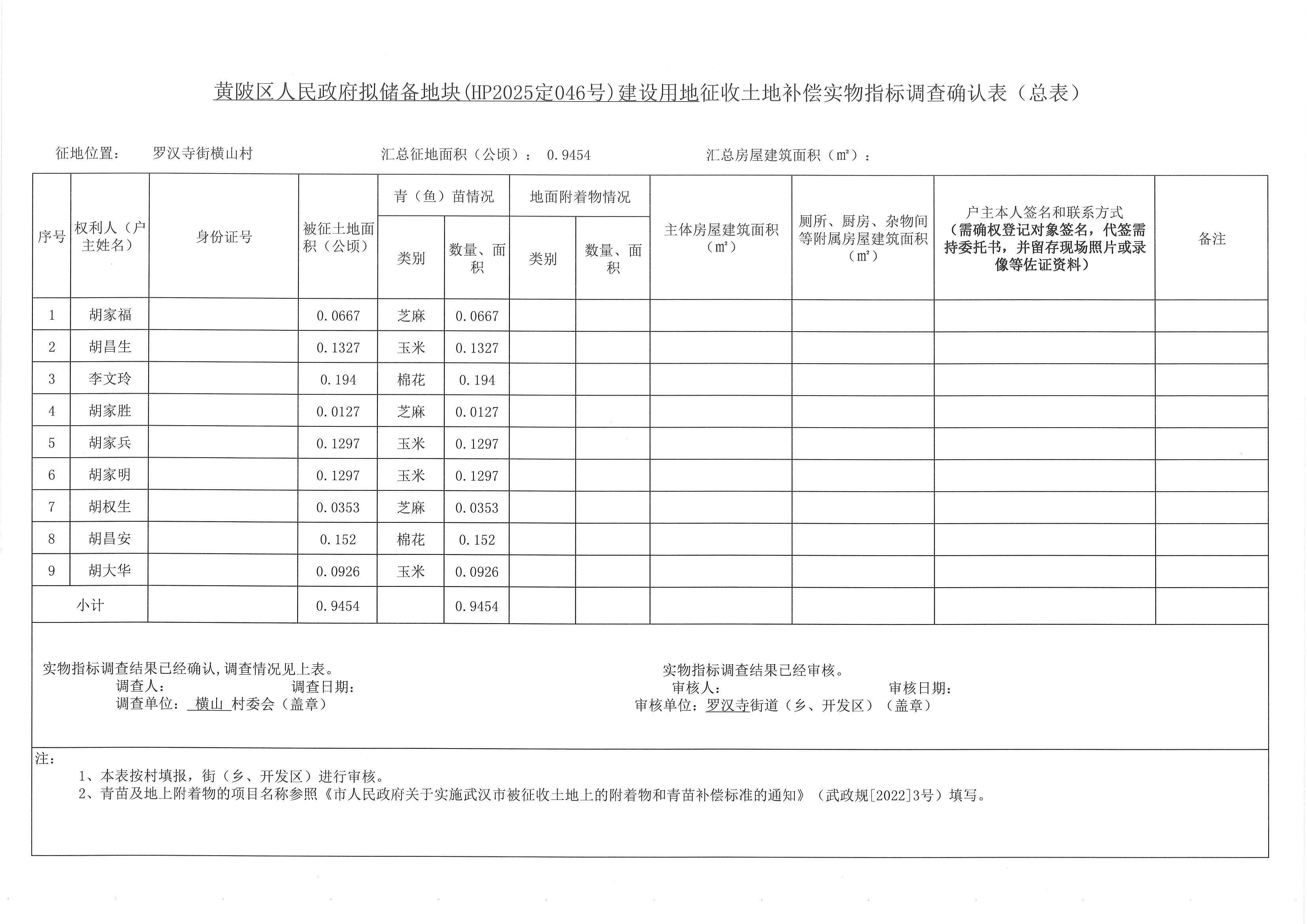 因实施《黄陂区人民政府拟储备地块(HP2025定046号)项目建设等公共利益需要,黄陂区人民政府拟征收罗汉寺街横山村共计0.9454公顷,用地范围图详见附件1。土地用途为工业用地。