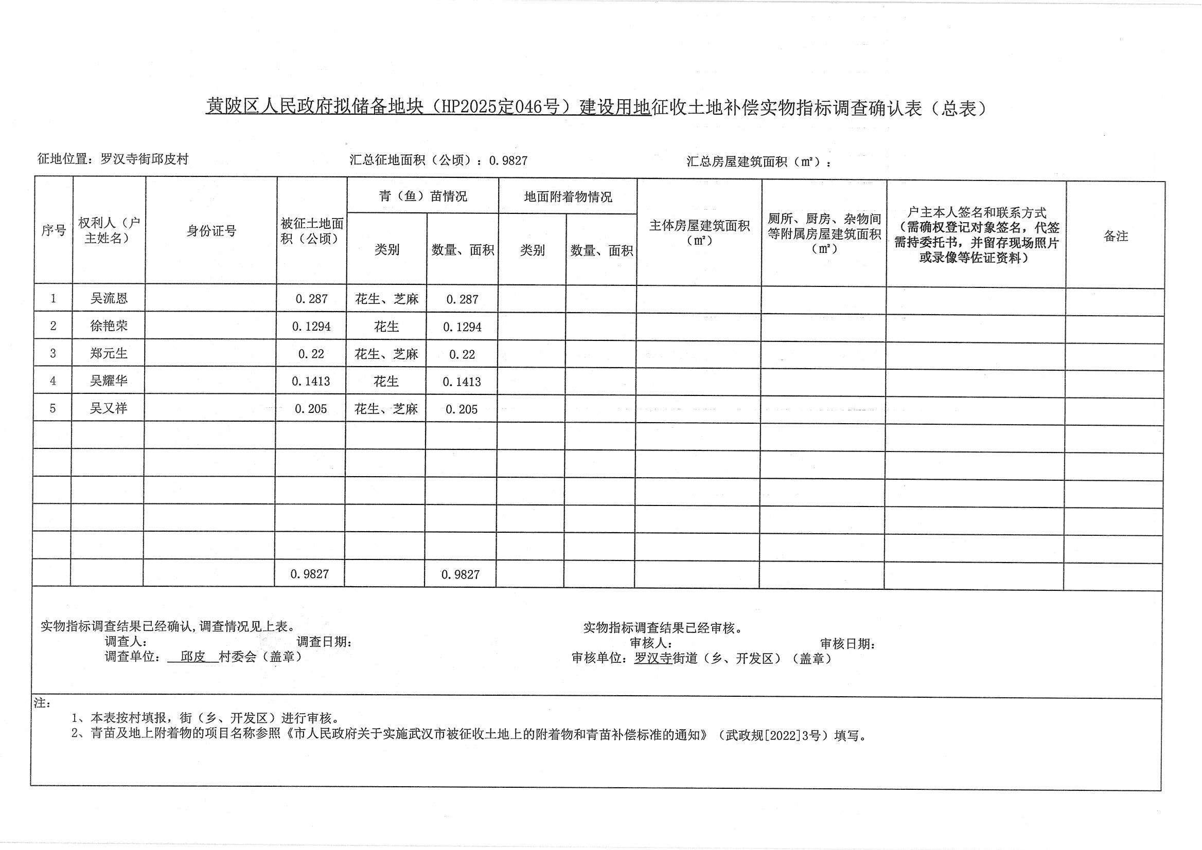 因实施《黄陂区人民政府拟储备地块(HP2025定046号)项目建设等公共利益需要,黄陂区人民政府拟征收罗汉寺街邱皮村共计0.9827公顷,用地范围图详见附件1。土地用途为工业用地。