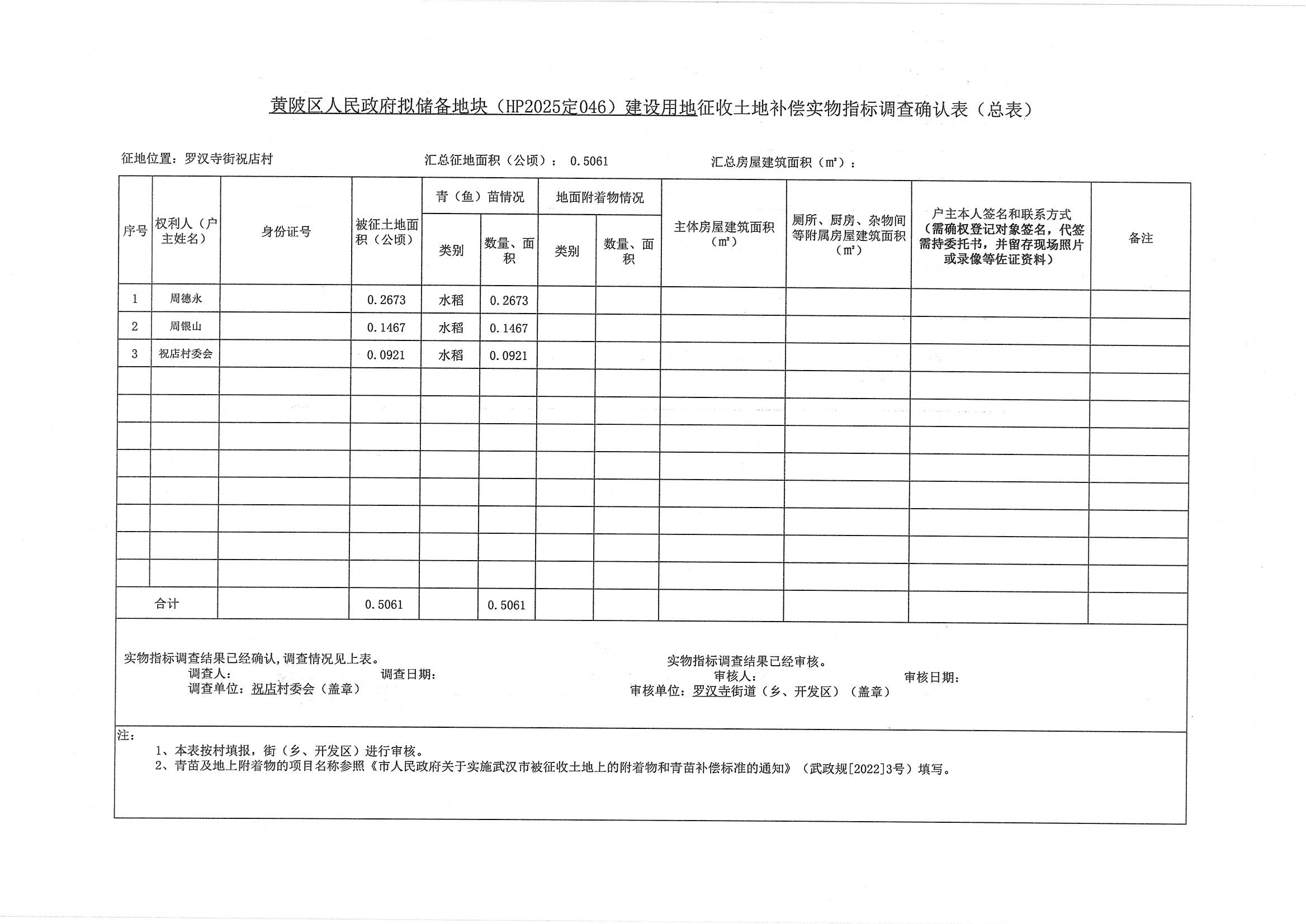 因实施《黄陂区人民政府拟储备地块(HP2025定046号)项目建设等公共利益需要,黄陂区人民政府拟征收罗汉寺街祝店村共计0.5061公顷,用地范围图详见附件1。土地用途为工业用地。
