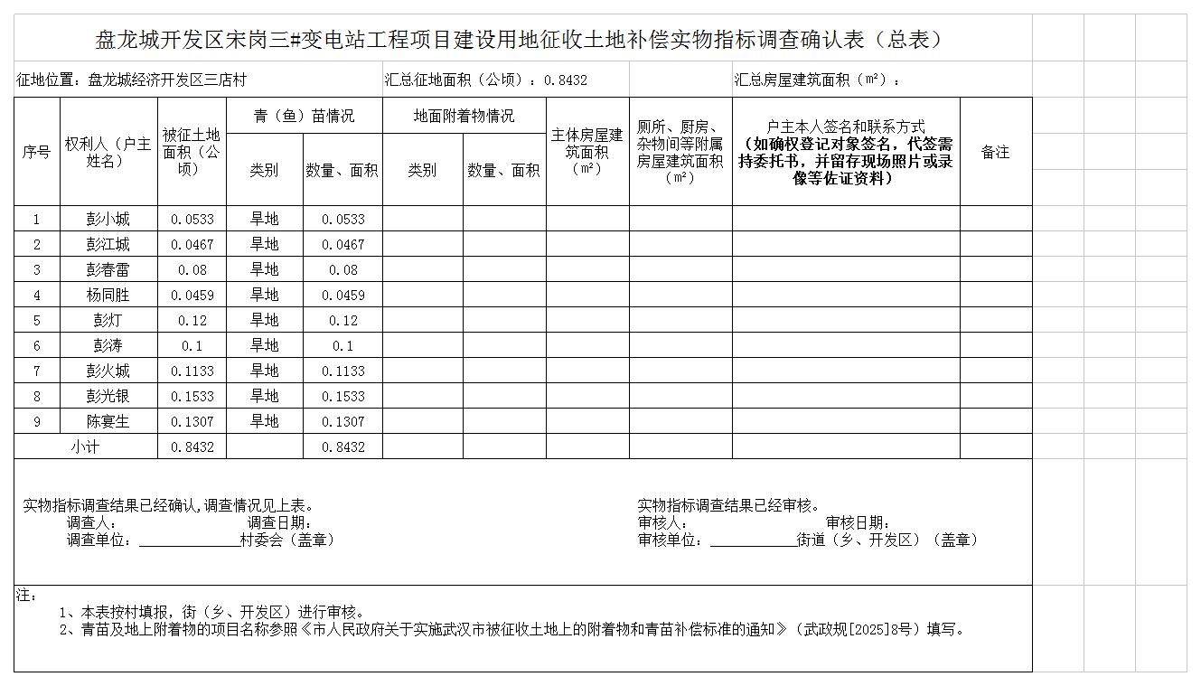 根据《中华人民共和国土地管理法》《中华人民共和国土地管理法实施条例》等法律法规和有关政策规定,结合土地征收预公告(陂土告字〔2025〕007号),黄陂区人民政府对拟征收土地的土地现状调查情况,被征地农民参加养老保险调查情况和社会稳定性风险评估情况,黄陂区人民政府组织了征地补偿安置方案,拟对盘龙城经济开发区三店村农民集体土地进行征收。现将宋岗三#变电站工程建设用地征地补偿安置方案内容和有关事项公告如下: