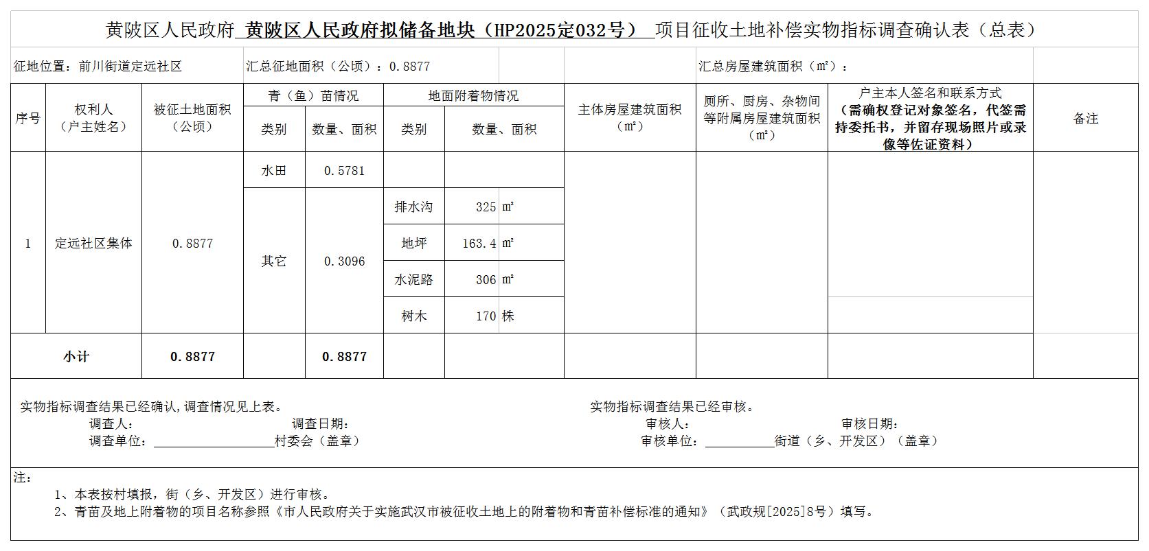 根据《中华人民共和国土地管理法》《中华人民共和国土地管理法实施条例》等法律法规和有关政策规定,结合土地征收预公告(陂土告字〔2025〕032号),黄陂区人民政府对拟征收土地的土地现状调查情况,被征地农民参加养老保险调查情况和社会稳定性风险评估情况,黄陂区人民政府组织了征地补偿安置方案,拟对前川街定远社区农民集体土地进行征收。现将黄陂区人民政府拟储备地块(HP2025定032号)项目建设用地征地补偿安置方案内容和有关事项公告如下: