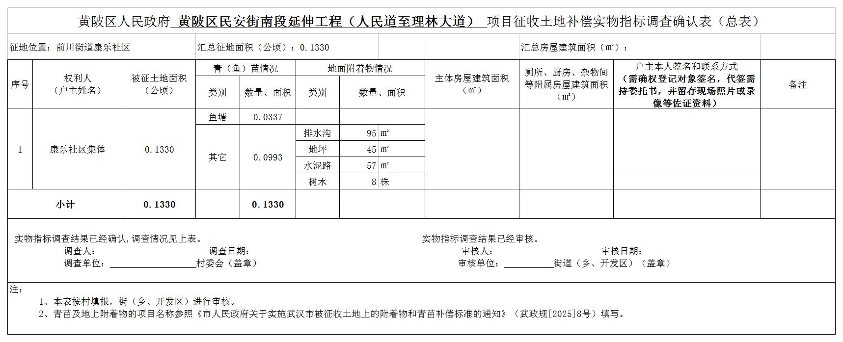 因实施黄陂区民安街南段延伸工程(人民道至理林大道)建设等公共利益需要,黄陂区人民政府拟征收前川街康乐社区共计0.1330公顷,用地范围图详见附件1。土地用途为城镇村道路用地。