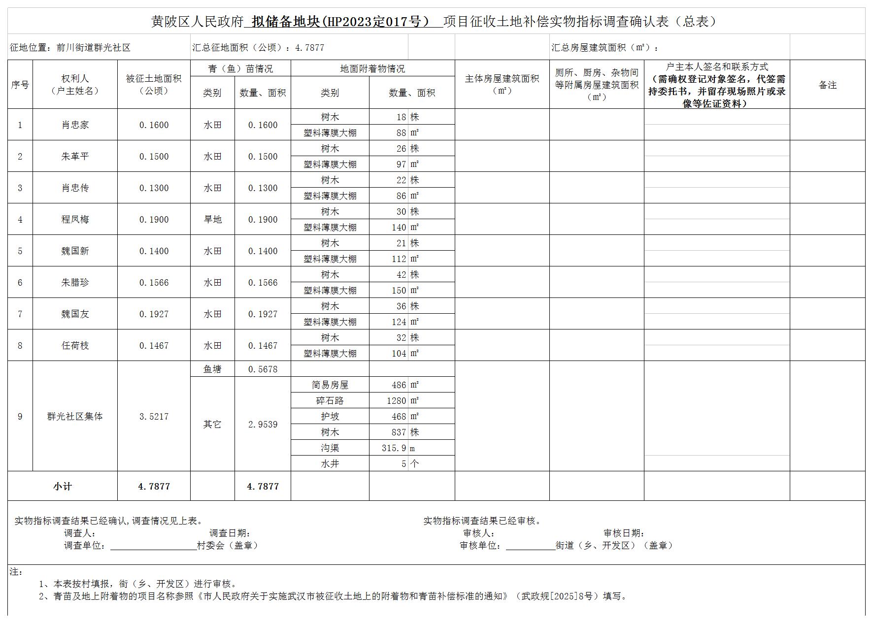 根据《中华人民共和国土地管理法》《中华人民共和国土地管理法实施条例》等法律法规和有关政策规定,结合土地征收预公告(陂土告字〔2025〕016-1号),黄陂区人民政府对拟征收土地的土地现状调查情况,被征地农民参加养老保险调查情况和社会稳定性风险评估情况,黄陂区人民政府组织了征地补偿安置方案,拟对前川街群光社区农民集体土地进行征收。现将黄陂区人民政府拟储备地块(HP2023定017号)征地补偿安置方案内容和有关事项公告如下: