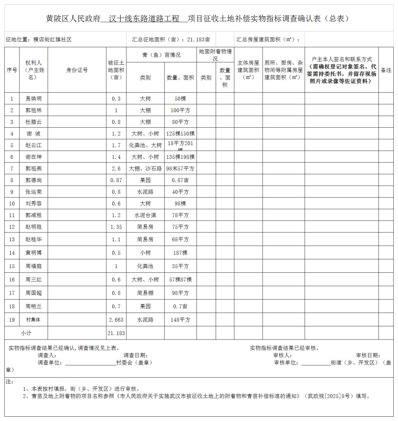 根据《中华人民共和国土地管理法》《中华人民共和国土地管理法实施条例》等法律法规和有关政策规定,结合土地征收预公告(陂土告字〔2025〕076-2号),黄陂区人民政府对拟征收土地的土地现状调查情况,被征地农民参加养老保险调查情况和社会稳定性风险评估情况,黄陂区人民政府组织了征地补偿安置方案,拟对横店街红旗社区农民集体土地进行征收。现将黄陂区横店汉十线东路道路工程建设用地征地补偿安置方案内容和有关事项公告如下: