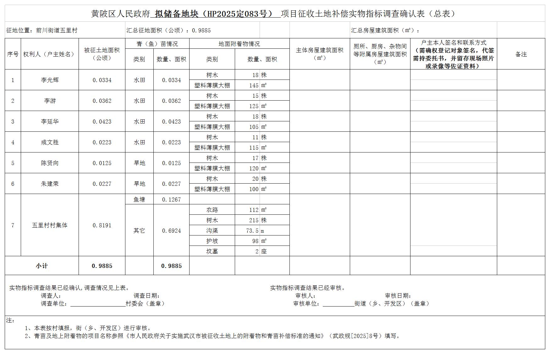 本次已对土地现状开展详尽调查,共涉及我区前川街五里村农民集体土地总面积0.9885公顷,其中农用地面积0.9877公顷(耕地0.1694公顷),建设用地0.0008公顷,未利用地/公顷。现状调查结果详见附件2。