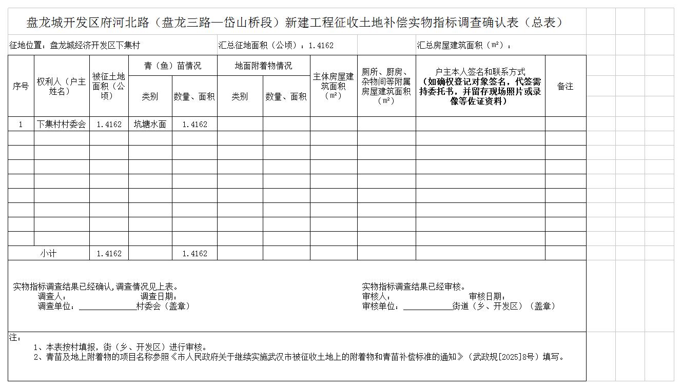 因实施黄陂区盘龙城开发区府河北路(盘龙三路——岱山桥段)新建工程建设等公共利益需要,黄陂区人民政府拟征收盘龙城经济开发区下集村共计1.4162公顷,用地范围图详见附件1。土地用途为公路用地。