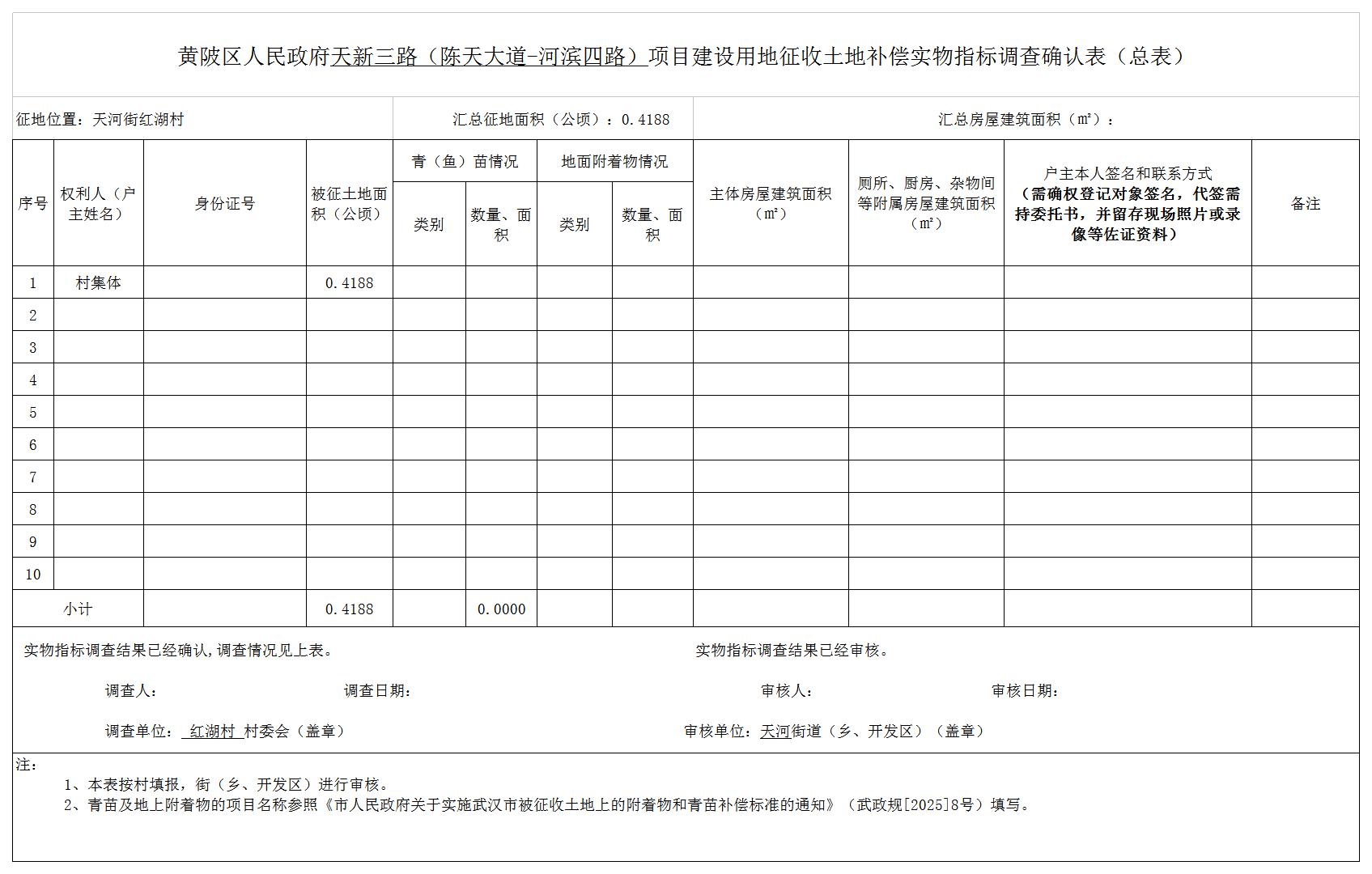 因实施天新三路(陈天大道-河滨四路)道路工程建设等公共利益需要,黄陂区人民政府拟征收天河街红湖村共计0.4188公顷,用地范围图详见附件1。土地用途为城镇村道路用地。