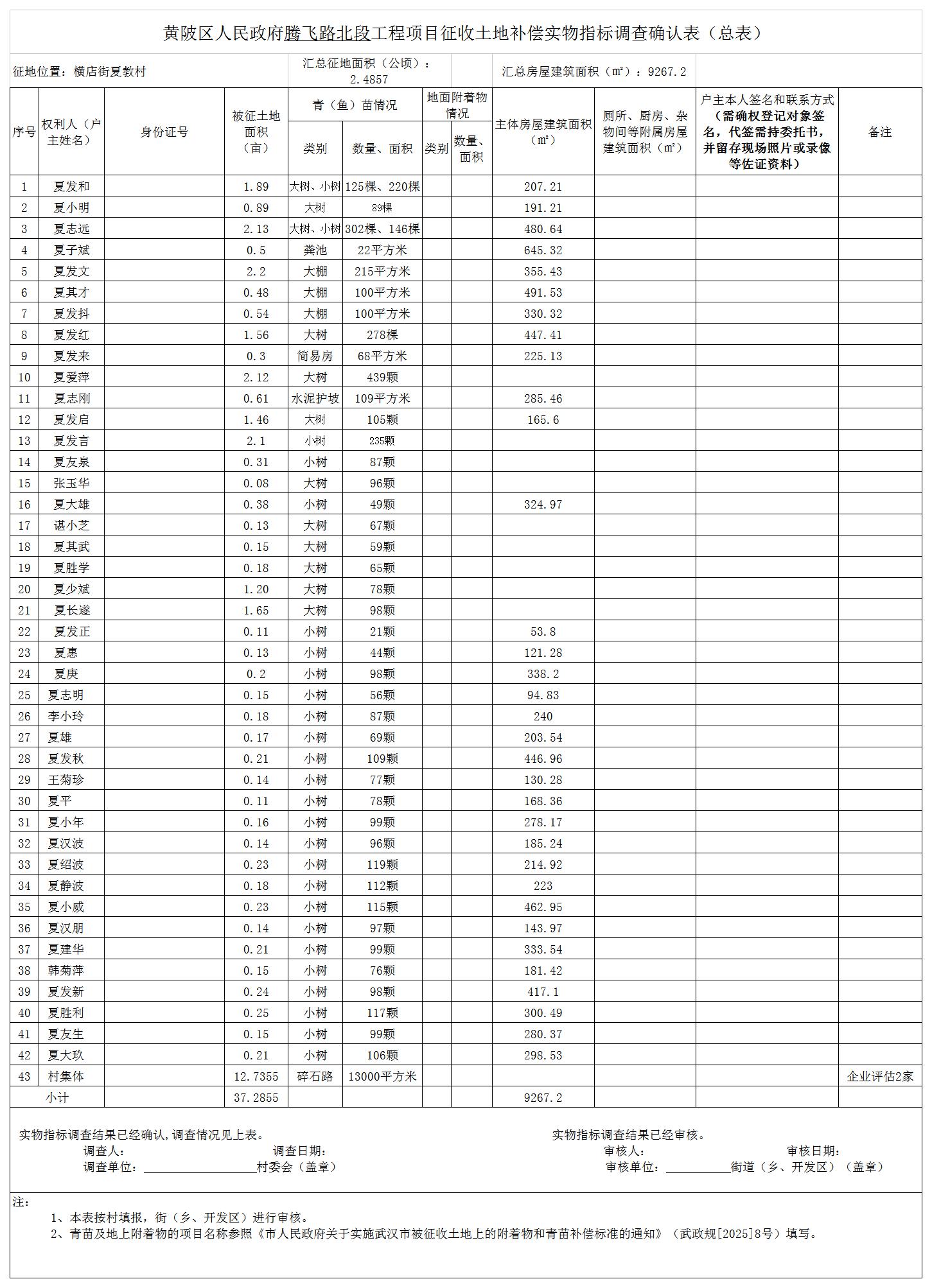 因实施腾飞路北段工程建设等公共利益需要,黄陂区人民政府拟征收横店街夏教村共计2.4857公顷,用地范围图详见附件1。土地用途为城镇村道路用地。