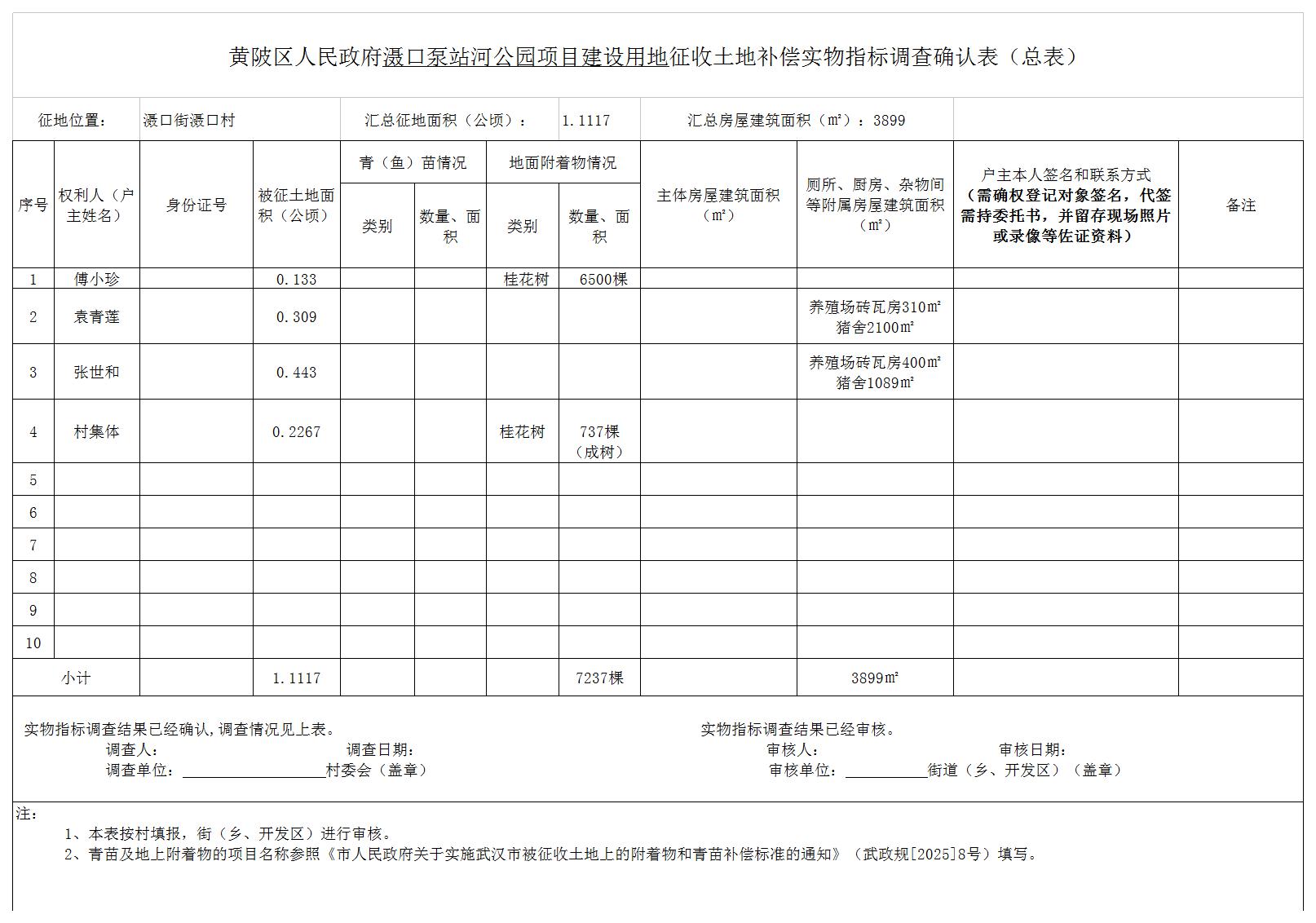 因实施滠口泵站河公园项目建设等公共利益需要,黄陂区人民政府拟征收滠口街滠口村共计1.1117公顷,用地范围图详见附件1。土地用途为公园绿地。
