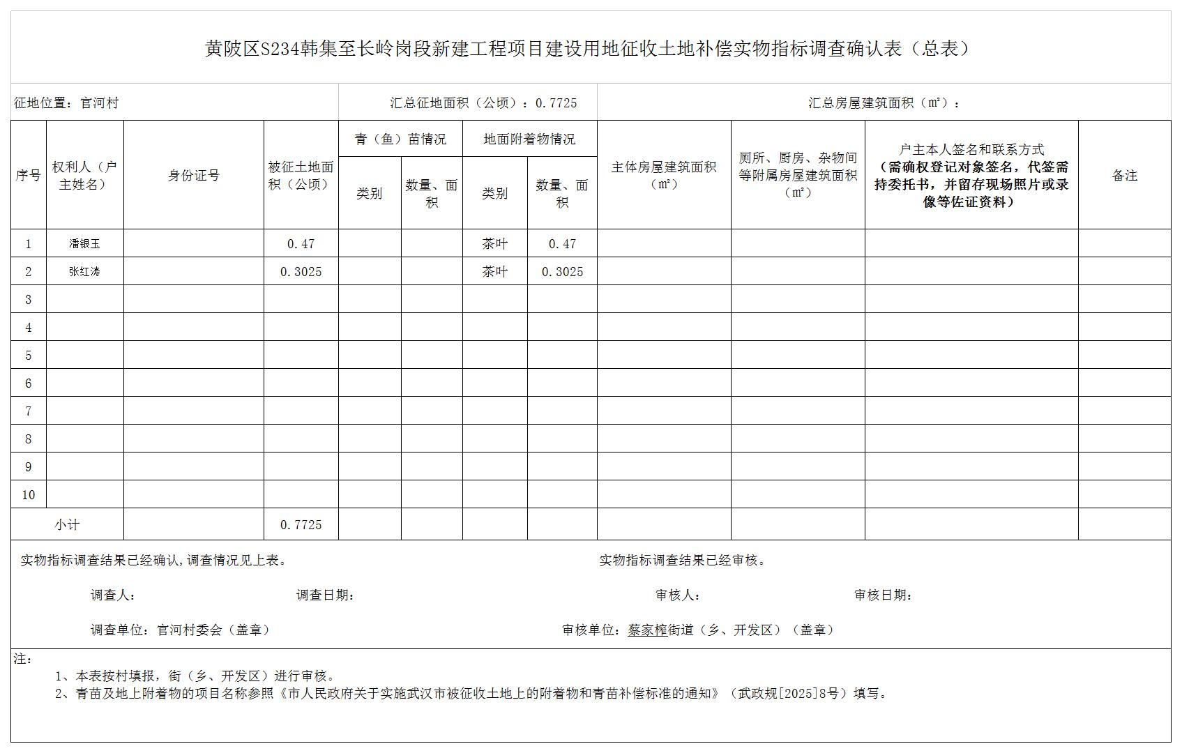 根据《中华人民共和国土地管理法》《中华人民共和国土地管理法实施条例》等法律法规和有关政策规定,结合土地征收预公告(陂土告字〔2026〕002-3号),黄陂区人民政府对拟征收土地的土地现状调查情况,被征地农民参加养老保险调查情况和社会稳定性风险评估情况,黄陂区人民政府组织了征地补偿安置方案,拟对蔡家榨街官河村农民集体土地进行征收。现将S234黄陂区韩集至长岭岗段新建工程建设用地征地补偿安置方案内容和有关事项公告如下: