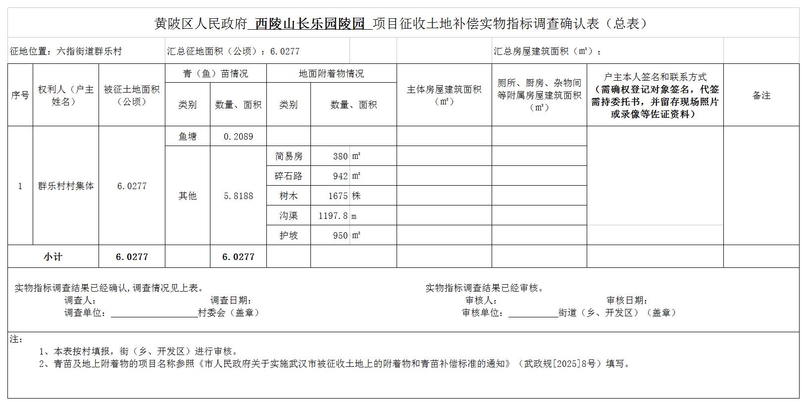 因实施西陵山长乐园陵园项目建设等公共利益需要,黄陂区人民政府拟征收六指街群乐村共计6.0277公顷,用地范围图详见附件1。土地用途为殡葬用地。