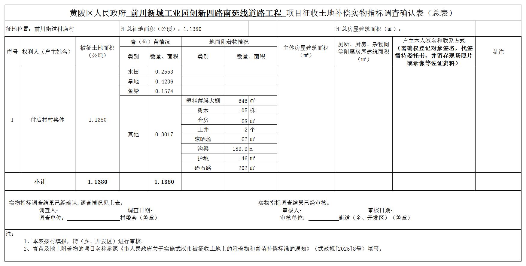 本次已对土地现状开展详尽调查,共涉及我区前川街付店村农民集体土地总面积1.1380公顷,其中农用地面积0.8415公顷(耕地0.6789公顷),建设用地0.2965公顷,未利用地/公顷。现状调查结果详见附件2。