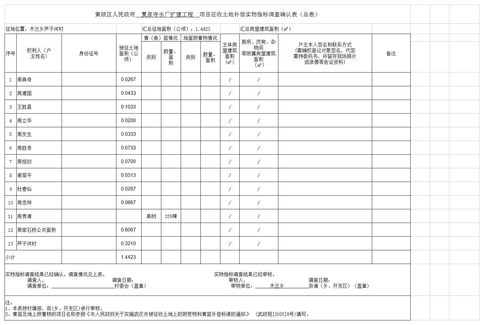 本次已对土地现状开展详尽调查,共涉及我区木兰乡芦子河村农民集体土地总面积1.4423公顷,其中农用地面积1.4423公顷(耕地/公顷),建设用地/公顷,未利用地/公顷。现状调查结果详见附件2。