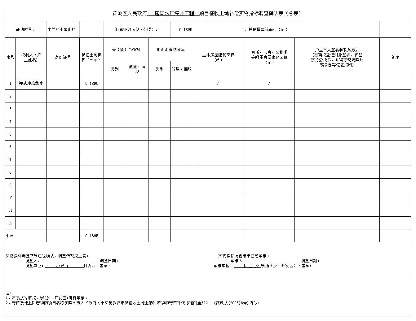 根据《中华人民共和国土地管理法》《中华人民共和国土地管理法实施条例》等法律法规和有关政策规定,结合土地征收预公告(陂土告字〔2026〕008号),黄陂区人民政府对拟征收土地的土地现状调查情况,被征地农民参加养老保险调查情况和社会稳定性风险评估情况,黄陂区人民政府组织了征地补偿安置方案,拟对木兰乡小泉山村农民集体土地进行征收。现将塔耳水厂集并工程建设用地征地补偿安置方案内容和有关事项公告如下: