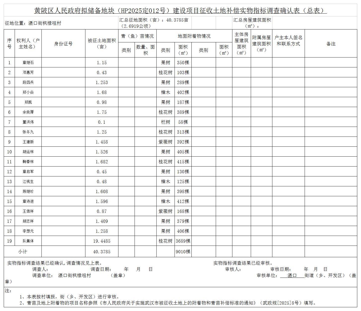 因实施黄陂区人民政府拟储备地块(HP2025定012号)项目建设等公共利益需要,黄陂区人民政府拟征收滠口街枫橡咀村共计2.6919公顷,用地范围图详见附件1。土地用途为工业用地。