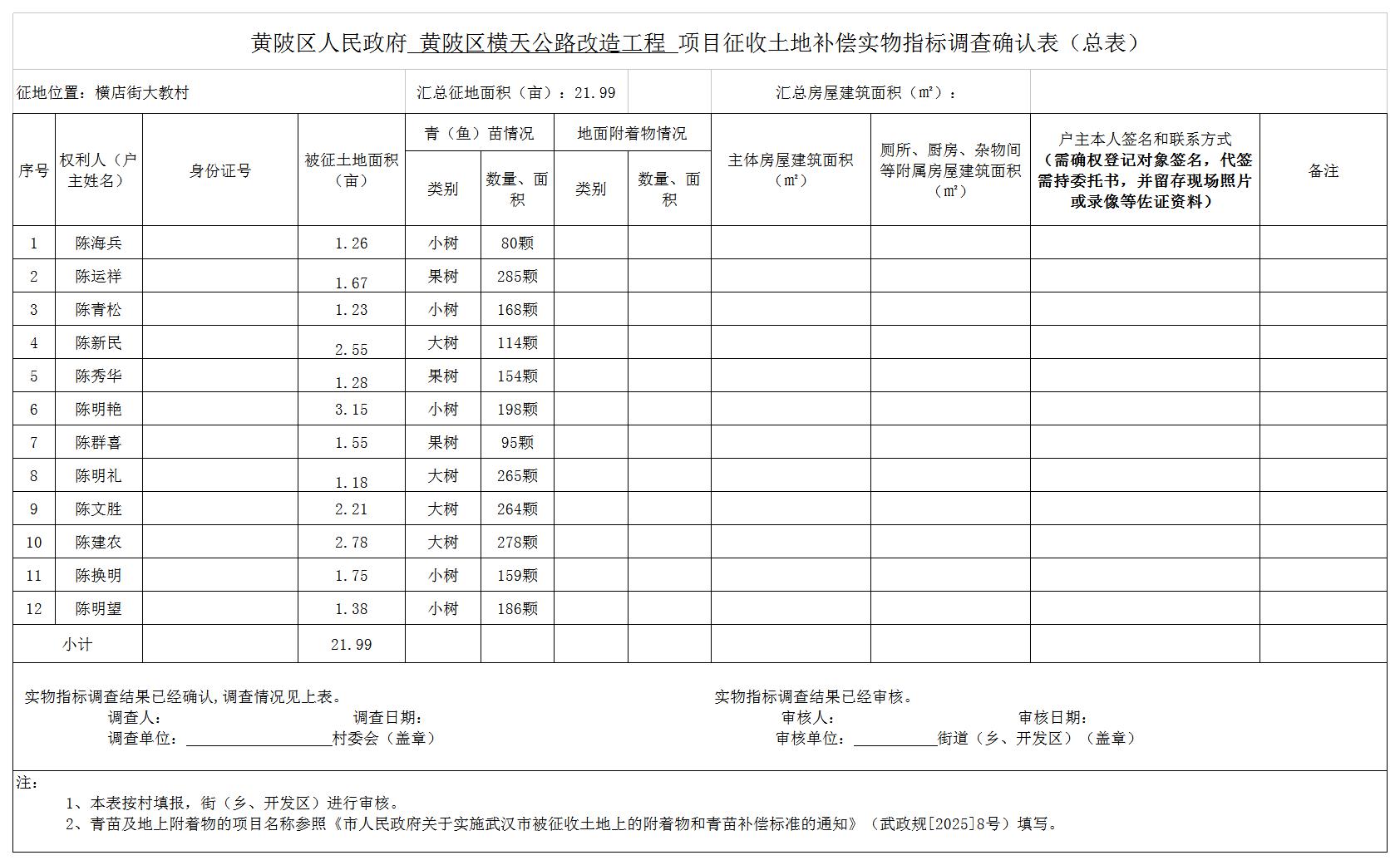 根据《中华人民共和国土地管理法》《中华人民共和国土地管理法实施条例》等法律法规和有关政策规定,结合土地征收预公告(陂土告字〔2026〕014-3号),黄陂区人民政府对拟征收土地的土地现状调查情况,被征地农民参加养老保险调查情况和社会稳定性风险评估情况,黄陂区人民政府组织了征地补偿安置方案,拟对横店街大教村农民集体土地进行征收。现将黄陂区横天公路改造工程建设用地征地补偿安置方案内容和有关事项公告如下: