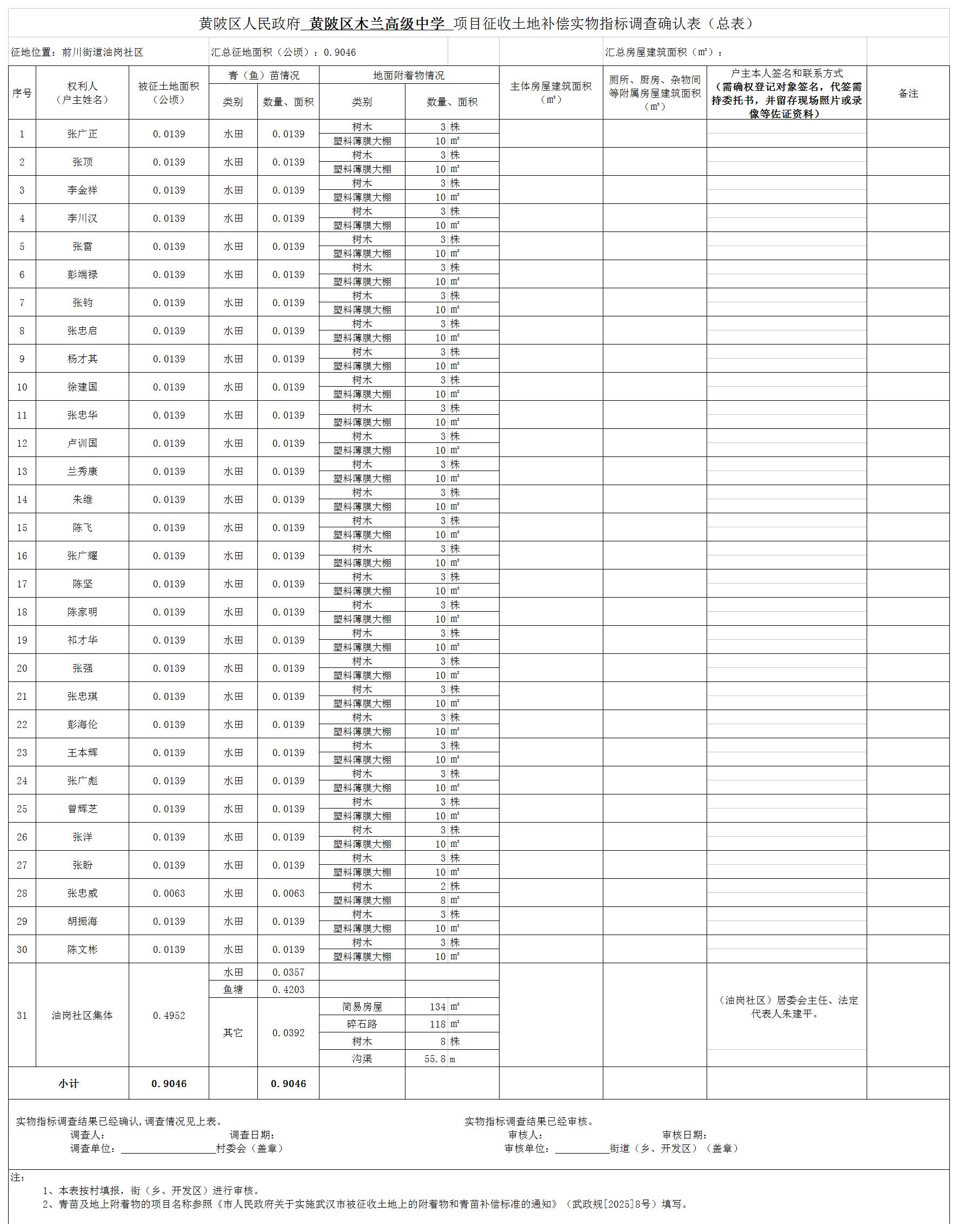 因实施黄陂区木兰高级中学项目建设等公共利益需要,黄陂区人民政府拟征收前川街油岗社区共计0.9046公顷,用地范围图详见附件1。土地用途为教育用地。