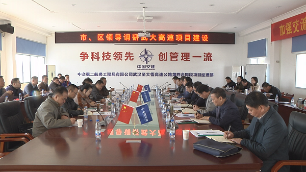在听取相关情况汇报后,市交通局有关负责人对武大高速项目生产建设情况给予充分肯定,并对下一步工作进行了部署。市交通局有关负责人指出,武大高速是武汉市交通建设的重点项目之一,项目的实施对于优化武汉市出口高速公路布局,缓解京港澳高速交通压力,推动中心城区与新城组团的综合发展有着重要的意义,市、区两级相关部门和相关建设单位要进一步统一思想认识,明确责任,加快推动武大高速项目建设;要主动作为,积极做好征地拆迁、完善手续等前期工作,确保按时间节点保质保量完成各项目标任务;要齐心协力,加强对接协调,做好服务,力争把武大高速建成精品工程,为武汉市以及沿线地区经济社会发展作出更大的贡献。