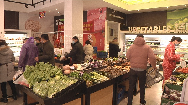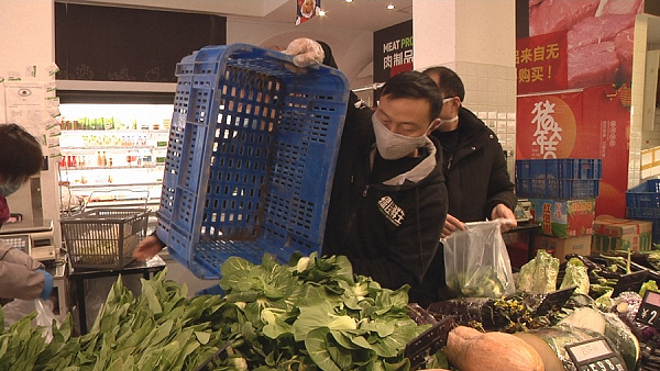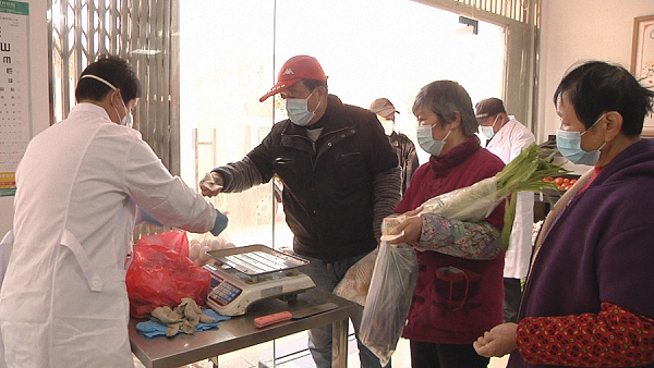 在直供点,横店街建国社区居民王群提着采购的蔬菜说: 我今天买的大蒜和莴苣,蛮新鲜,价格也蛮合理。也是买了不少菜的汪取先也说: 因为要隔离与外面过多的接触,我们不能到随便到外面去,所以我们今天来买菜,这个价格较优惠,防疫防范工作也做得好,我们群众都欢迎。