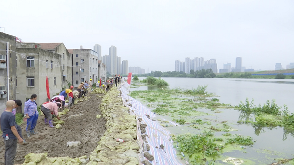 滠口街南湖村地理位置特殊,滠水、府河在此交汇注入长江,历来是防汛重点地段。南湖民垸大堤堤长11000米,堤顶高度28.5米,当前水位已超过27.5米的防洪限定水位,防汛形势严峻。记者今天下午在现场看到,南湖大堤上,街道组织的400余名抢险突击队正并肩作战,铲沙石、装沙袋、绑沙袋、运沙袋、堵河水,争分夺秒加高加固堤身,解除民堤隐患。