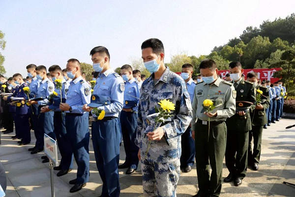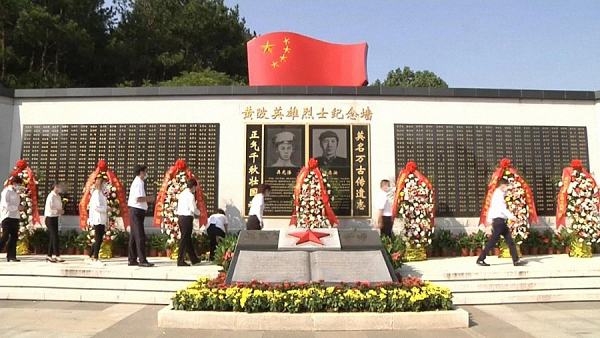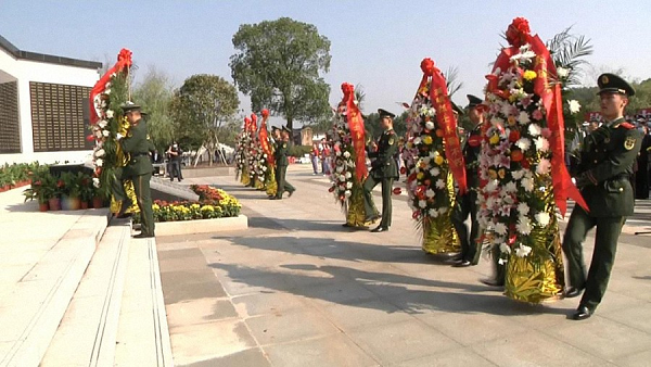 在《献花曲》的伴奏下,14名礼兵手抬花篮缓步走向烈士纪念墙,向烈士敬献花篮。