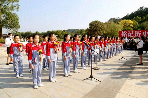 在苍松翠柏掩映下,长乐园陵园格外庄严肃穆。上午9时,全场齐声高唱中华人民共和国国歌。国歌唱毕,全场肃立,向烈士默哀。随后,少先队员齐致队礼,献唱《我们是共产主义接班人》,表达继承先烈光荣传统、踏着英烈足迹砥砺前行的志向和情怀。