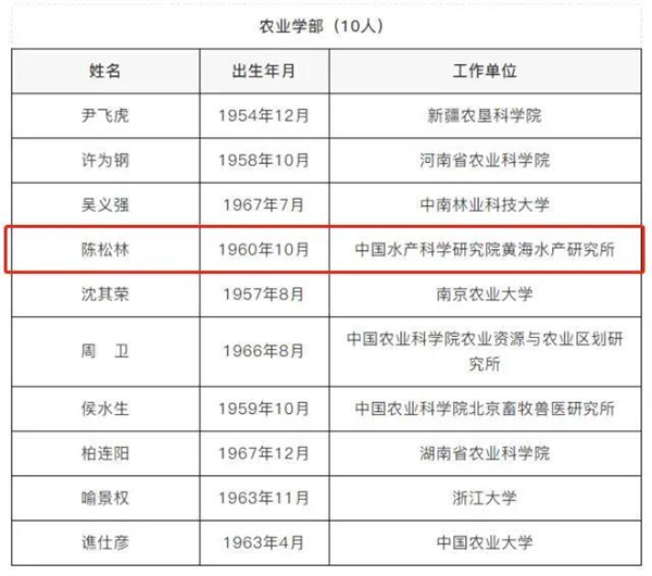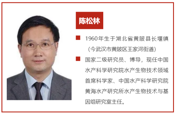 陈松林1960年10月25日生于湖北省黄陂县长堰镇(今武汉市黄陂区王家河街道),留德博士,国家二级研究员、博导,现任中国水产科学研究院水产生物技术领域首席科学家、中国水产科学研究院黄海水产研究所水产生物技术与基因组研究室主任。兼任中国水产学会常务理事、水产生物技术专业委员会主任委员,中国农业生物技术学会常务理事,山东省泰山学者攀登计划专家,山东省海洋渔业生物技术与遗传育种重点实验室主任,国际著名刊物Scientific Reports和Mar Biotechnol编委,国家自然科学基金委学科评审专家。