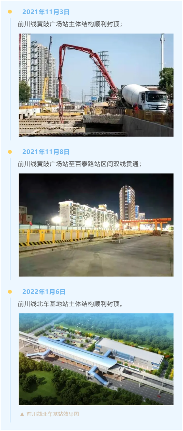 2022年1月6日下午,武汉地铁前川线迎来新年“开门红”,伴随着最后一方混凝土浇筑完成,武汉地铁前川线北车基地站主体结构顺利封顶。