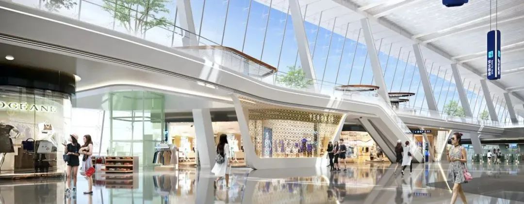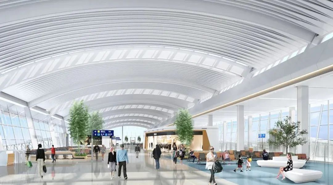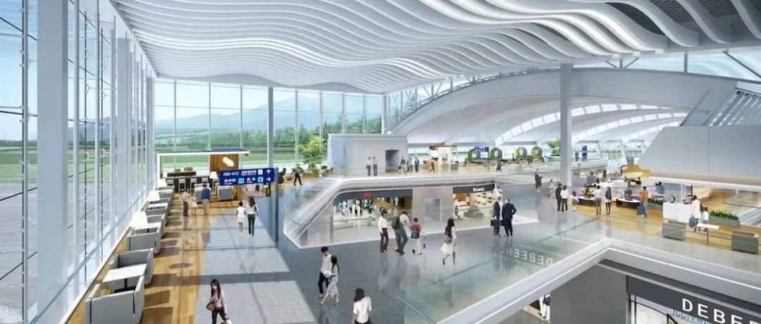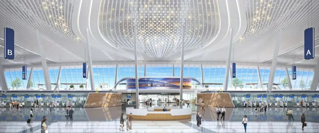 穿过“星河涟漪”图案的大厅向前望去,其夹层中央将设置弧形曲面裸眼3D屏,采用立体成像技术,3D大屏的背后将打造城市打卡点。这里将配置沙发座椅及小餐桌,透过玻璃幕墙可观看飞机起降,既能欣赏美景,又能品味咖啡,在这里享受一段身心放松的候机时光,整个设计以人为本,提升旅客体验感。