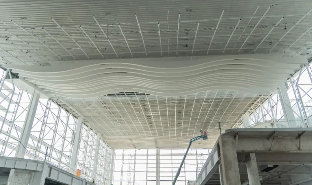 根据前期规划,T2航站楼大厅吊顶以“浪花”星河图案为中心,“涟漪”势态向两侧扩散,形成动态波浪形,故称“星河璀璨、律动涟漪”。