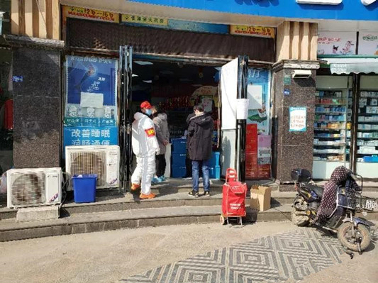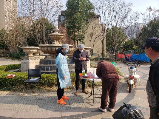他随同社区网格员张燕给社区志愿者送防护物资;