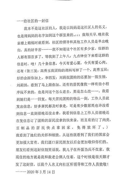 刚开始,社区向居民发放《给居民的一封信》,提醒居民注意防护,如今多位居民向社区发来《给社区的一封信》,向社区所有领导和工作人员致敬!