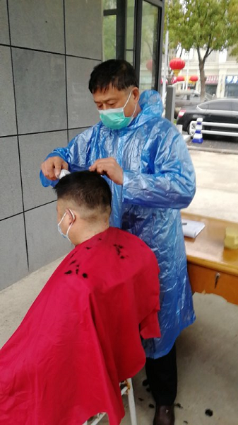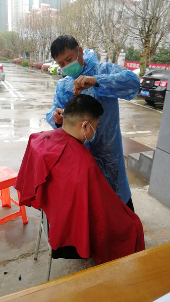 3月21日下午4时许,在黄陂区前川街百锦街一小区路边,65岁的邓永清师傅,自备防护用品,正在为居民陈先生理发。
