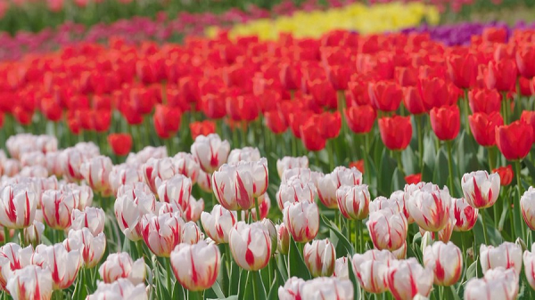 木兰花乡景区工作人员肖文君兴致盎然地介绍:我们的郁金香数量达到了数万株,它的面积有近千亩。有很多来过我们花乡的游客,肯定对我们去年的郁金香印象是很深的。今年的郁金香是在去年的基础上突破了很多。大家可以看到我们今年的搭配是非常好的。