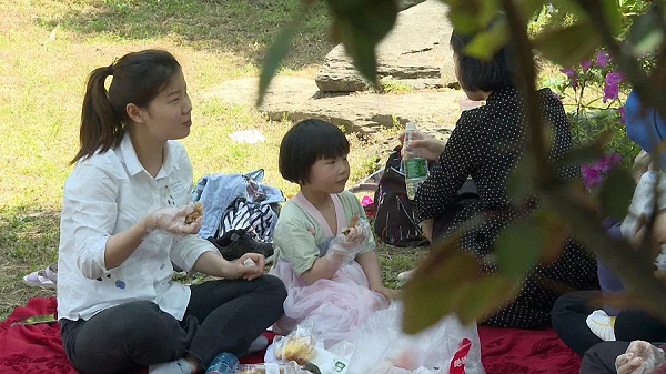 We first met Xiao Nan's family. "It's a nice day to come out and relax. We've had to stay at home for so long that we really want to come outside with our kid," said Xiao.