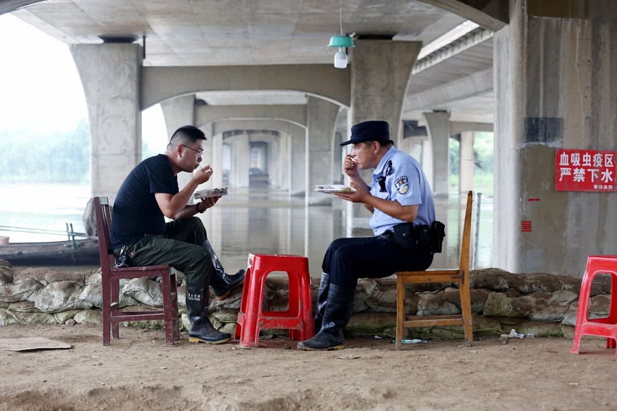 ▲7月21日,卫东在河堤边吃盒饭,他已连续吃了11天的盒饭。