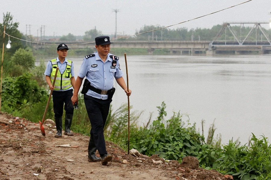 ▲7月21日,卫东和同事在府澴河堤上查看水情。