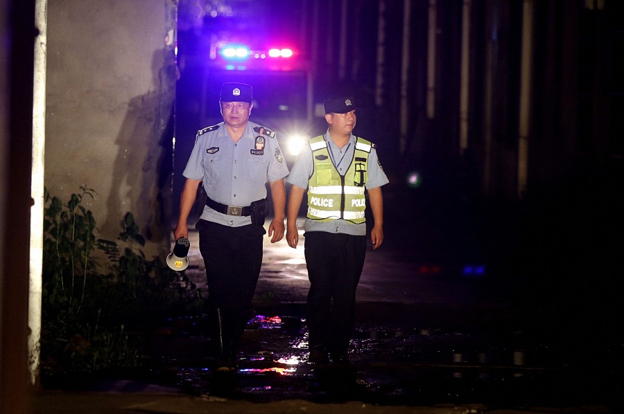 ▲7月21日晚,卫东和同事在村内民居巡逻。
