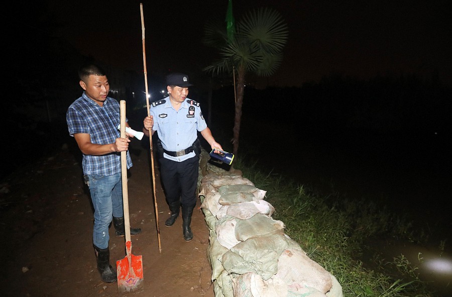 ▲7月21日晚,卫东和大队干部在朱家河堤上巡查。