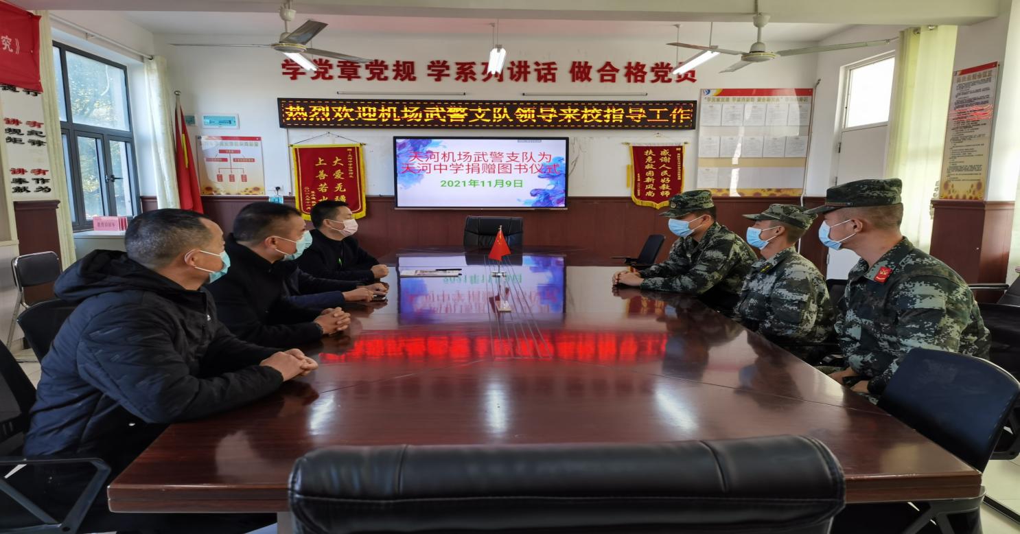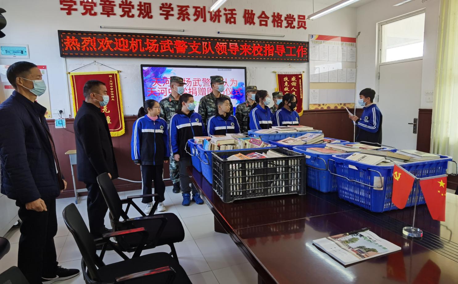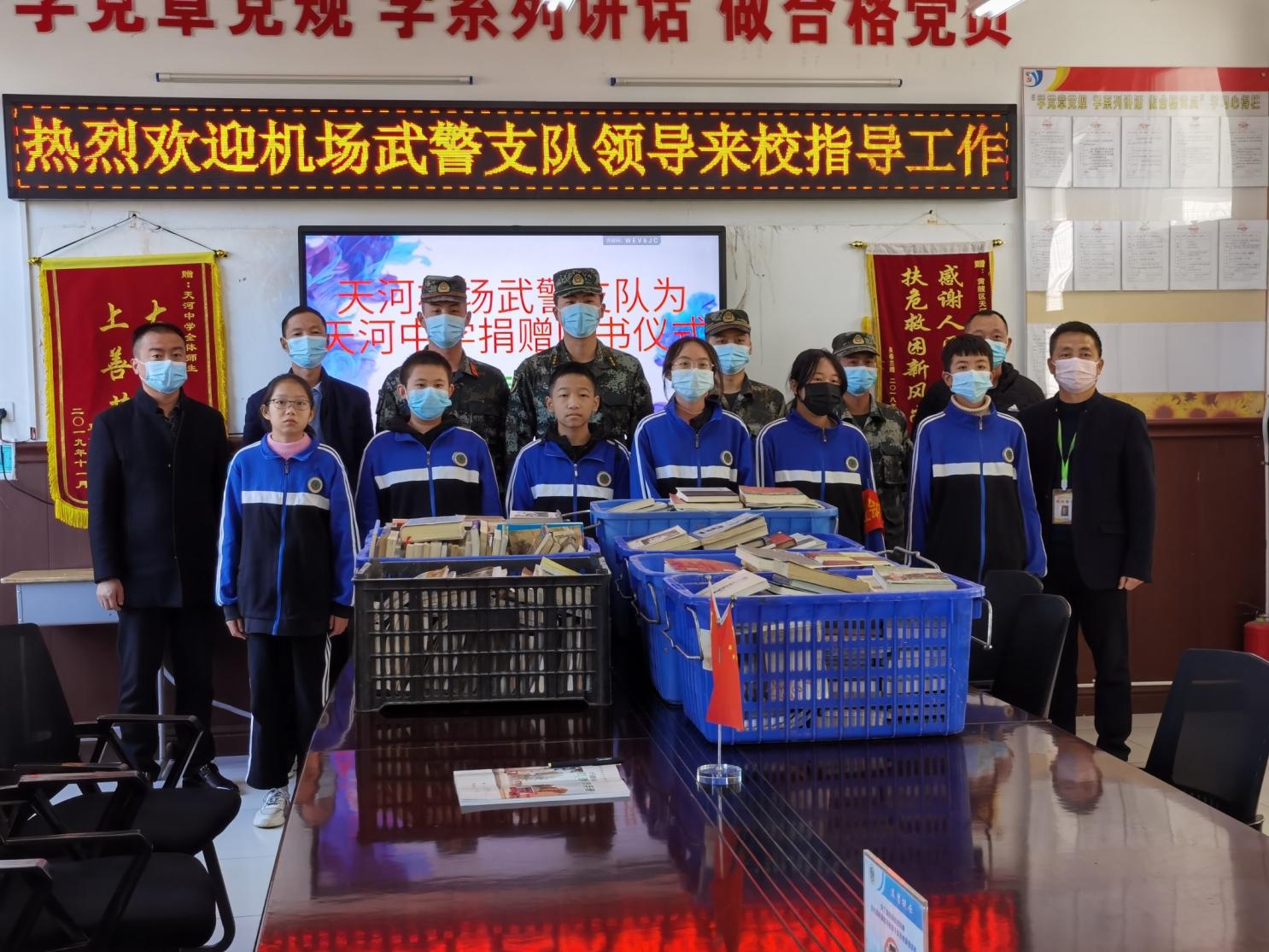 11月9日上午,天河机场武警支队一行五人在队长胡航豪的带领下来到天河中学,为学校捐赠了几百册图书,为丰富学生的知识面、支持天河地区的教育事业贡献警队的一份力量,充分体现了人民警察对教育事业的关注和支持,对莘莘学子的关心和厚爱。天河中学校长汪绍忠等相关负责人热情接待了他们并举行了隆重的图书捐赠仪式。