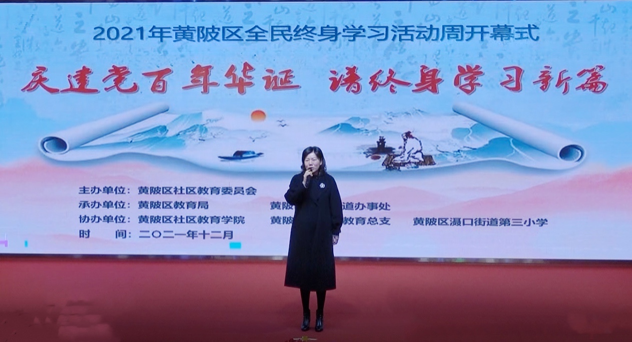 黄陂区教育局党委书记、局长黄淑萍宣布黄陂区2021年全民终身学习活动周开幕,随后汉口北中心幼儿园的老师们款款步上舞台,带来精彩的舞蹈《风筝误》。接着滠口小学的诗朗诵《做终身学习型教师》、滠口二小的合唱《送别》、《卢沟谣》等节目接连上演,精彩纷呈,不断掀起高潮。